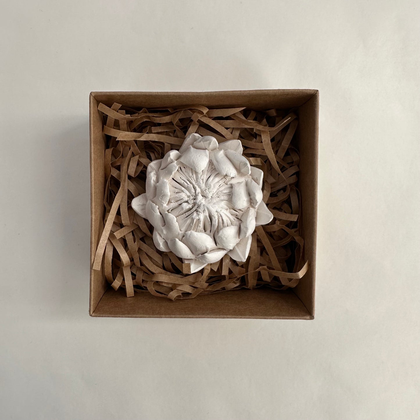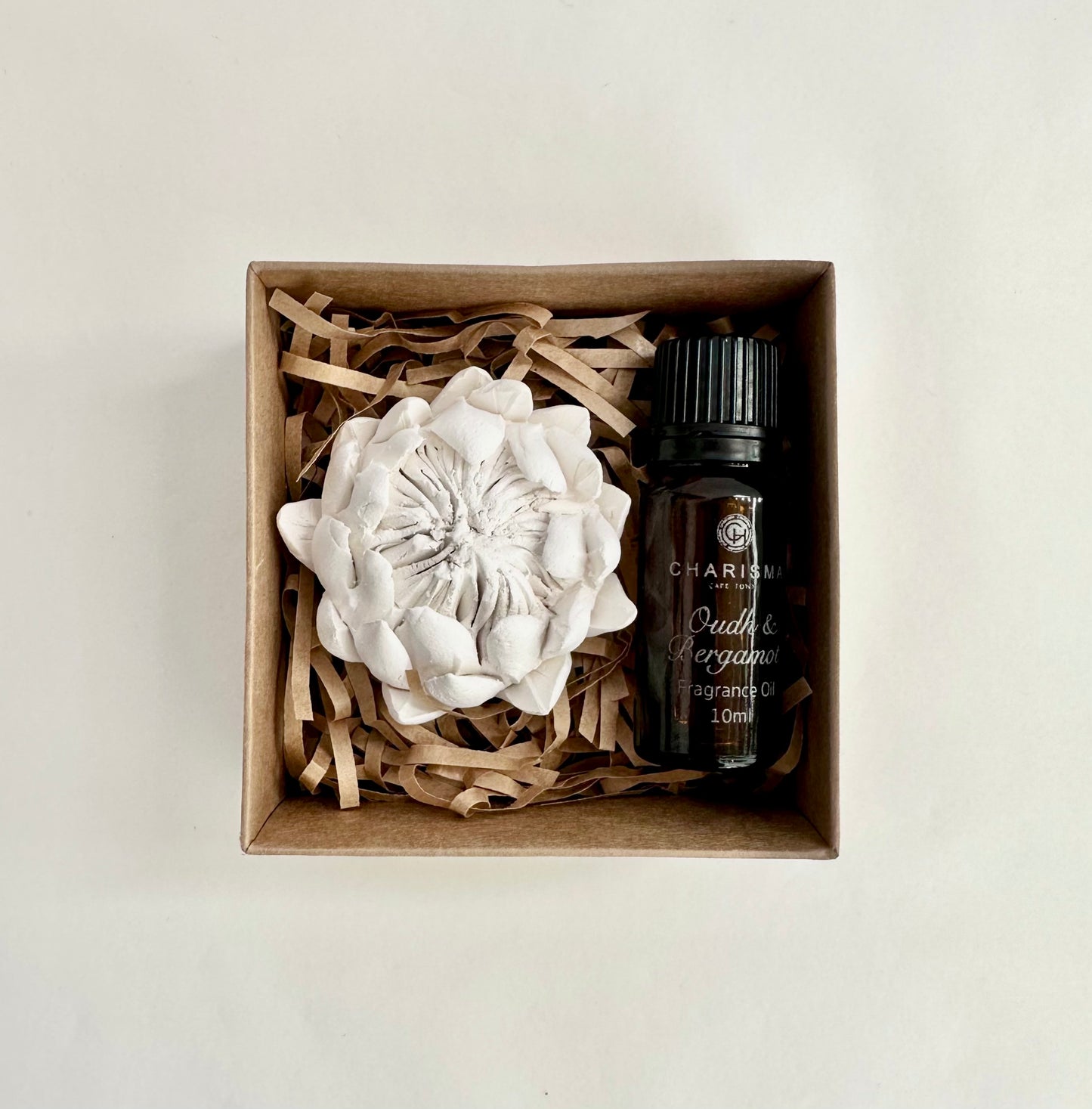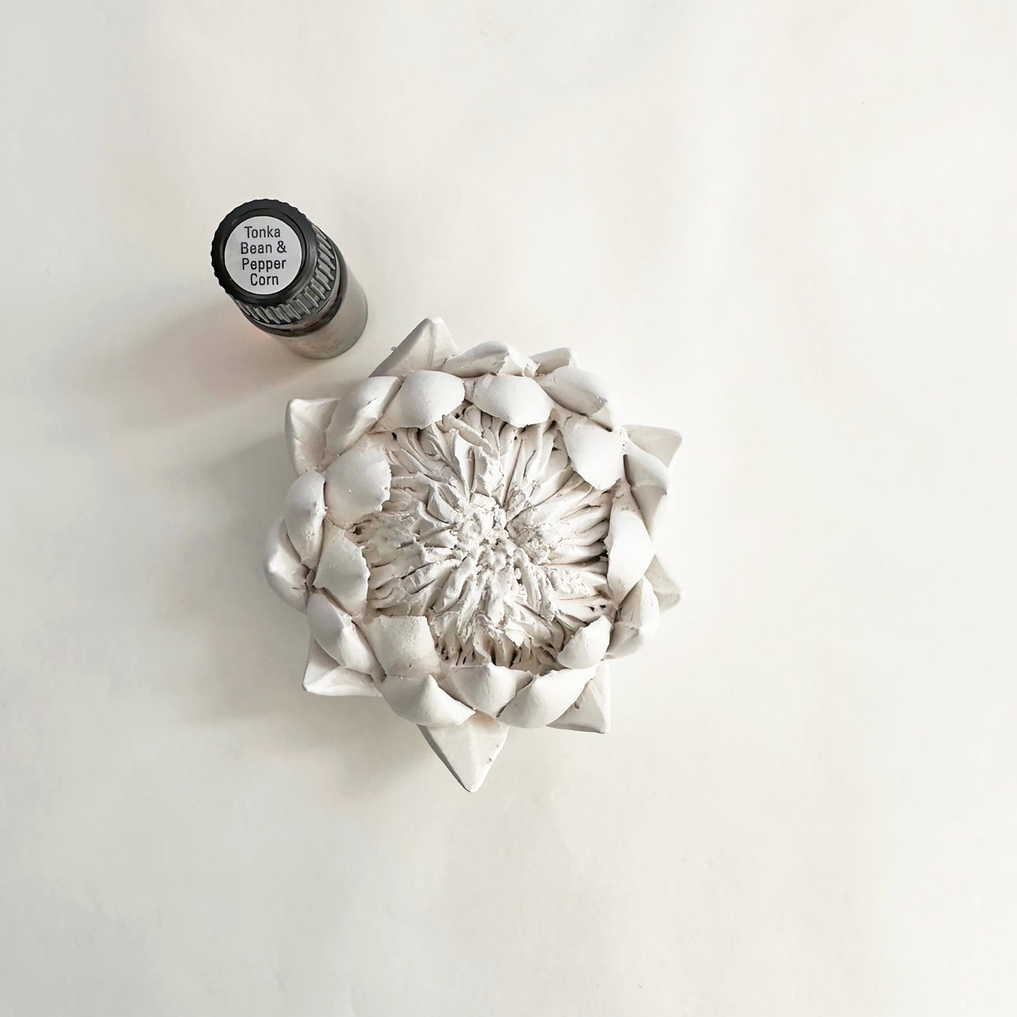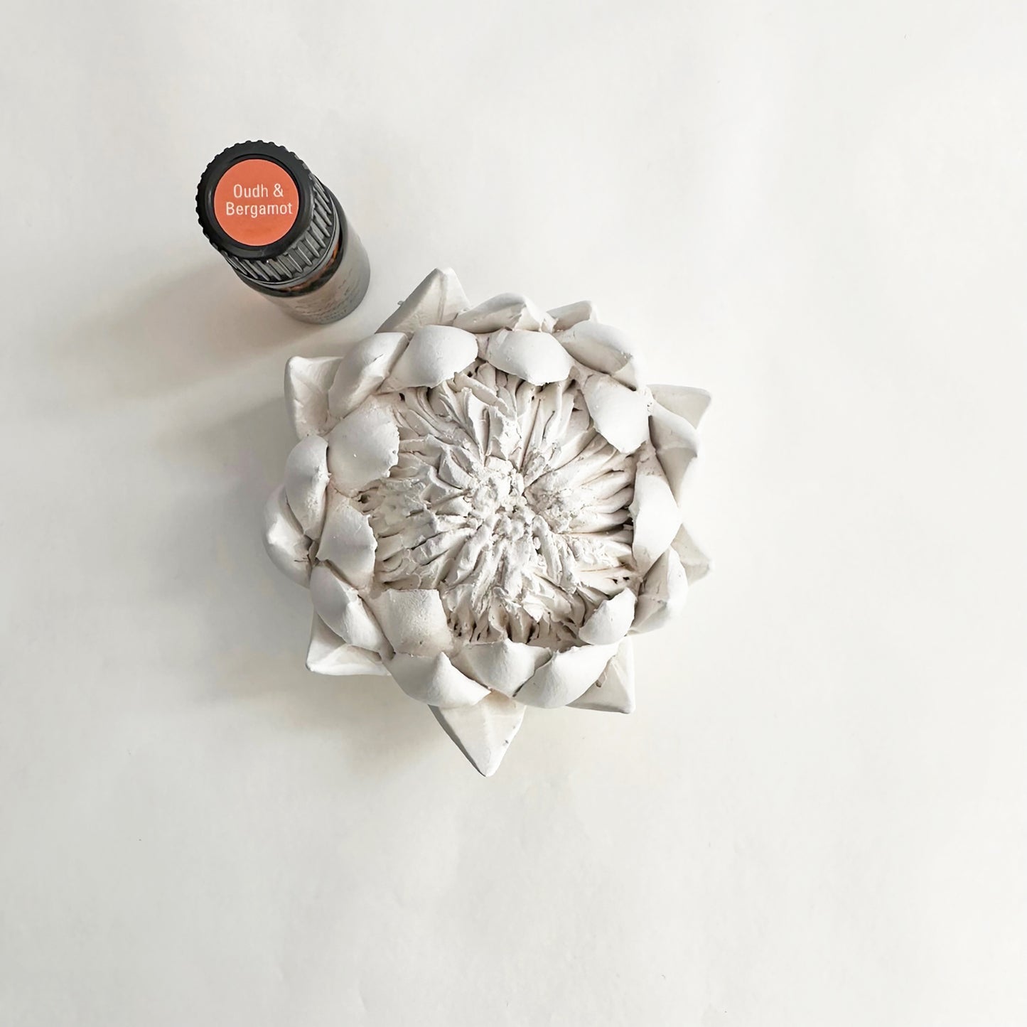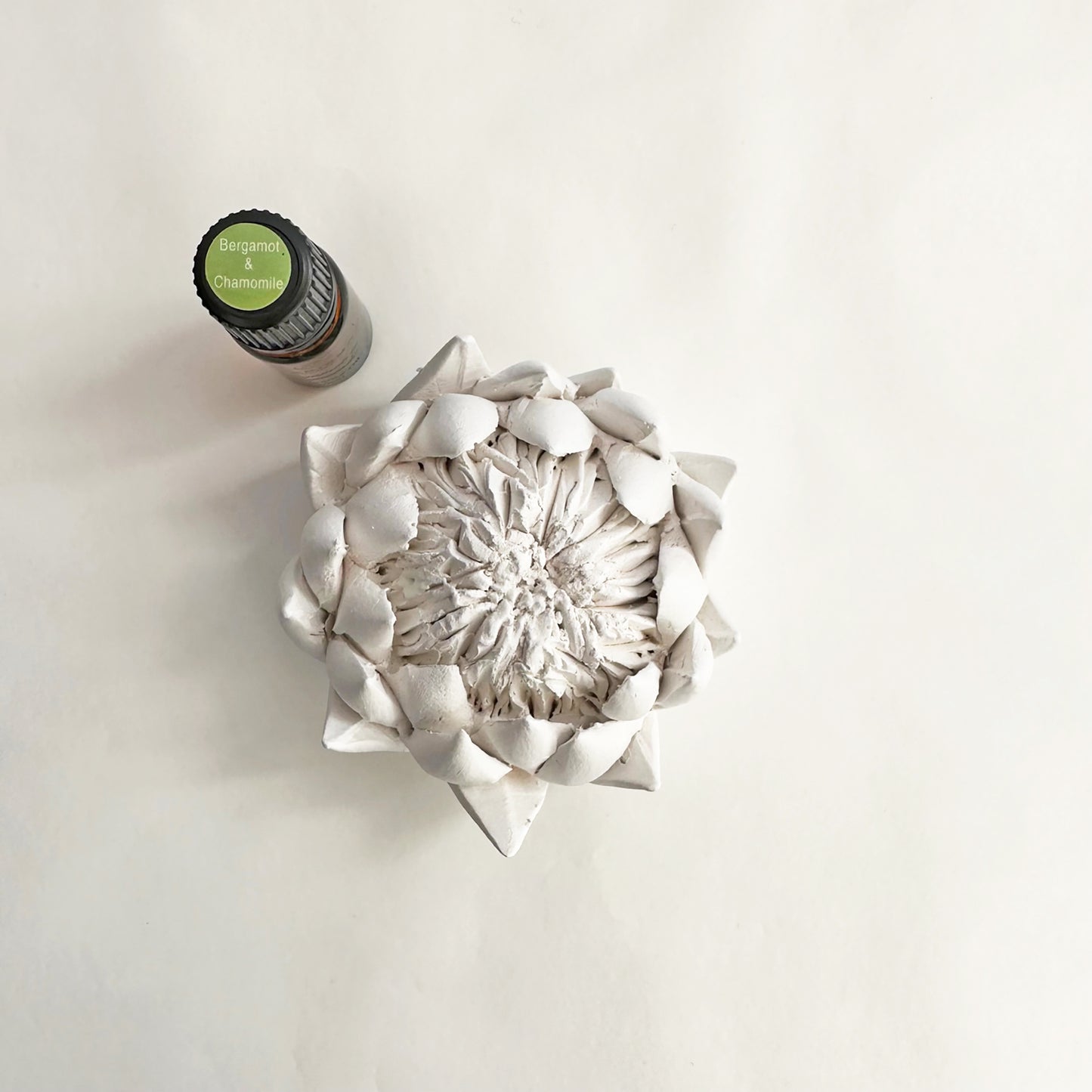 These bisqueware porcelain proteas are porous allowing them to absorb fragranced or essential oils and diffuse them within a space such as in the bathroom, your bedroom or linen closet. With just a few drops of the included oil (your choice of either bergamot & chamomile, or oud & bergamot), you can beautifully scent your home for weeks.